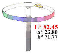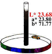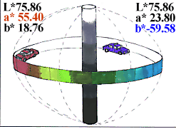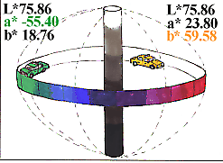 | In a practical way, we now have the tools to take measurement data from measuring several colored objects and calculate meaningful data that tells us what the color of each object is and the color difference between the objects. We express this data in the three dimensions of human color response. The mathematics is expressed as L, a, b factors defined as either Hunter L,a,b or CIE L,a,b: | ||