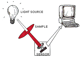 | Transmission instruments are designed to measure clear materials such as plastic films glass and liquids. The light source illuminates the sample, which acts like a colored filter, the light passes through the sample and the color analyzer receives the signal on the other side of the sample. The filtered light is converted to electrical responses across the visual spectrum, and the data calculated by a conversion device and transmitted to the computer. Analytical spectrophotometers used in chemical spectral analysis are designed this way. Transmission colorimeters use broad band filters that are designed to emulate the red, green, blue response similar to the cone cells of the human eye. Transmission spectrophotometers convert the spectral data to the red, green, blue response using the same mathematical models as reflectance color spectrophotometers.