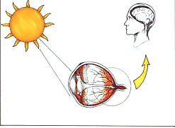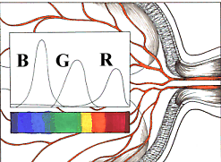 | - Three types of cone cells in the retina respond to the color balance of the light stimulus. There are red cone cell responders, green cone cell responders and blue cone cell responders. Since there are more than 7 million cone cells in the retina, we can see many different colors in one scene at the same time. Rod cells relate to the brightness of light (white to black). There are over 17 million rod cells. | ![]() |